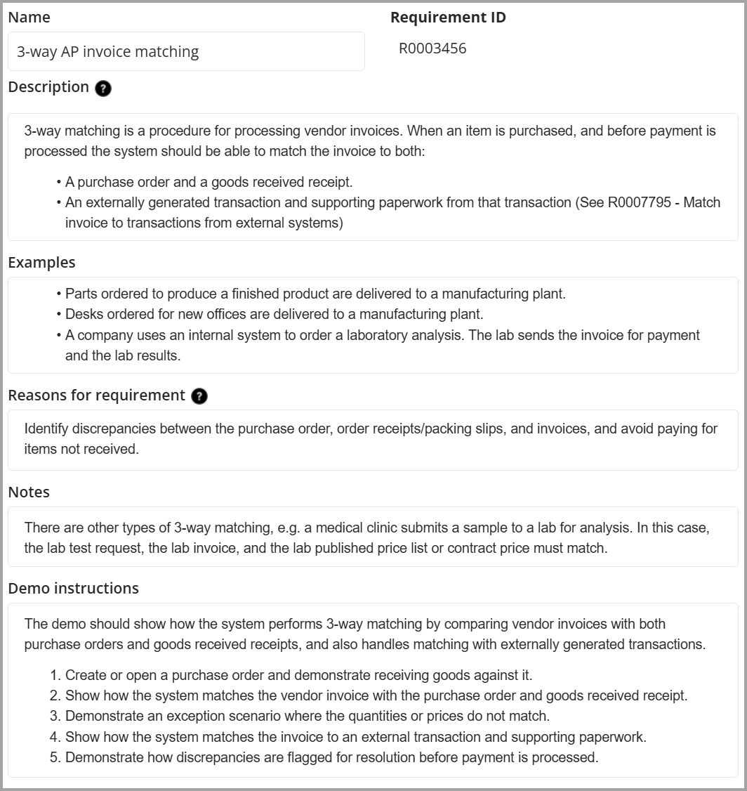 Each requirement is defined in practical detail so your team can see what the software must do, why it matters, and, if it will be demoed, what the demo should show. That makes it easier to test real fit instead of relying on broad claims, vague promises, or assumptions.