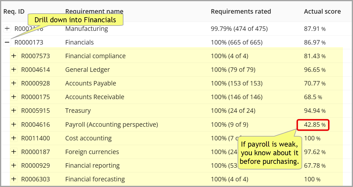 This view helps you spot where a product is strong, uncover where it falls short, and identify risks early, especially in critical areas like payroll, financial reporting, or manufacturing, where weaknesses can lead to workarounds, delays, added cost, and frustration long after the contract is signed.
